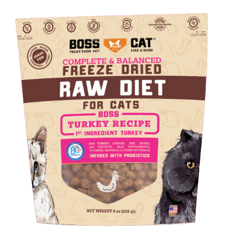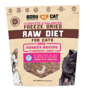 Boss Cat® Brand Freeze Dried Raw Diet is a simple and easy way to serve your feline friend a raw mealtime solution packed with probiotics. Our formula is a real crowd pleaser especially when it comes to cats refined palates. This complete mealtime solution is great for on the go use or as an every day complete mealtime solution. Being infused with probiotics this meal delivers a digestive benefit at every meal.