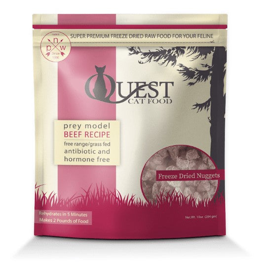 Steve's Real Food Freeze-Dried Cat Food uses the same great ingredients as the original Quest, we simply use a cold freeze-dry process to remove the moisture and make it shelf stable. Quest is a prey model diet of meats, organs, bones, and whole red krill for added Omega-3 fatty acids. It is incredibly palatable for our finicky felines. The nugget is a smaller than our original to be perfectly catered to cats.