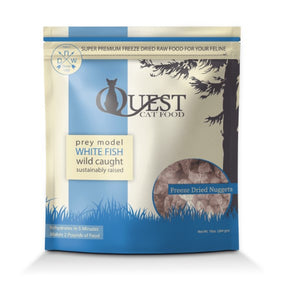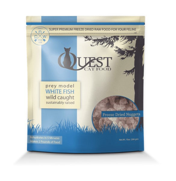 Steve's Real Food Freeze-Dried Cat Food uses the same great ingredients as the original Quest, we simply use a cold freeze-dry process to remove the moisture and make it shelf stable. Quest is a prey model diet of meats, organs, bones, and whole red krill for added Omega-3 fatty acids. It is incredibly palatable for our finicky felines. The nugget is a smaller than our original to be perfectly catered to cats.