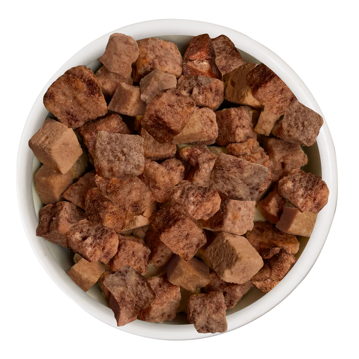 Gently cooked with 94% tuna, salmon, and tilapia and 0% bones or organs, our fully cooked freeze dried is packed with flavor so intense your cat will freak out! Bite-sized and ready to eat, our gently cooked cubes make mealtime effortless and irresistible while providing safe, worry-free handling and trusted nutrition.