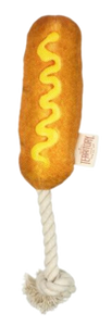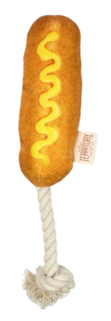 Mark Your TerritoryTM this carnival season with Original Territory's Corn Dog Tug Toy! This tug dog toy is made from durable materials such reinforced fabric and cotton & jute rope for long-lasting interactive play. In addition, we've also added a squeaker for exciting search-and-find fun. Great for tug-of-war, fetch, and other supervised play fun, your pup will have a hot diggity dog summer!